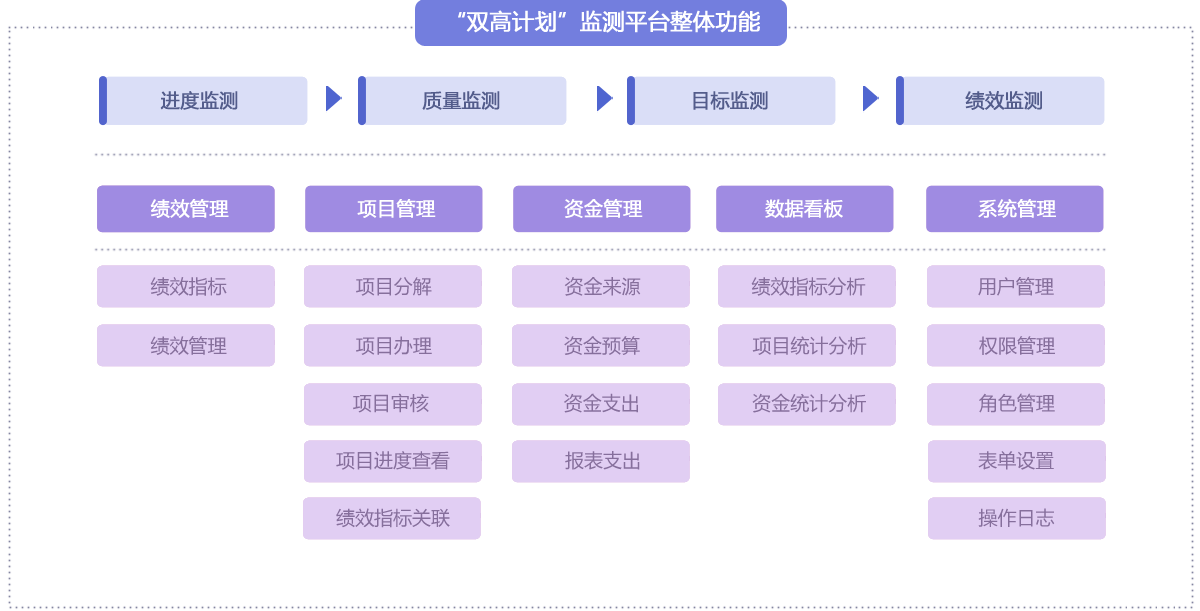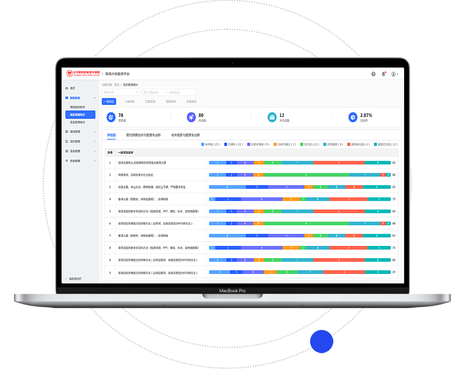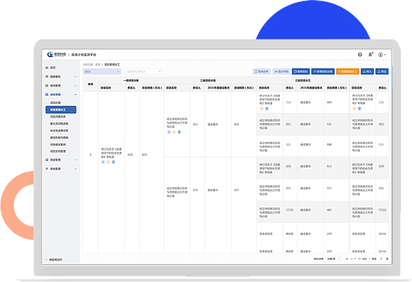 針對“雙高計劃”建設全過程任務管理和績效管理需求,覆蓋績效管理、項目管理、資金管理、數據看板、文檔管理等環節,實時監測任務進度、匯總績效指標數據、統計資金使用情況、一鍵導出上傳教育部平臺等,幫助學校加強項目實施管理,建立信息采集與績效管理系統,實行年度評價項目建設績效,依據設定的績效目標實施過程監控,開展績效評價并加強評價結果應用,高效推進學校雙高計劃建設工作。