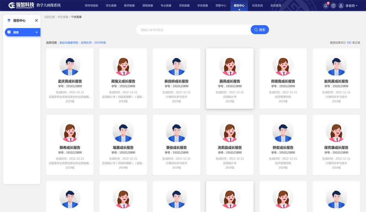 根據高校培養目標和人才理念,圍繞學生的學習能力、學習行為、能力圖譜、身心健康、思想道德、校園生活、學業達成、獎學勤貸懲處、學生成長報告的各類過程性數據,構建多元化、智能化、動態性、連續性的學生學業評價大數據模型,生成學生學業數字“畫像”,實時展現學生學習狀況,及時預測、預警異常狀況,為學校決策提供支撐,為學生學習成長提供幫助。