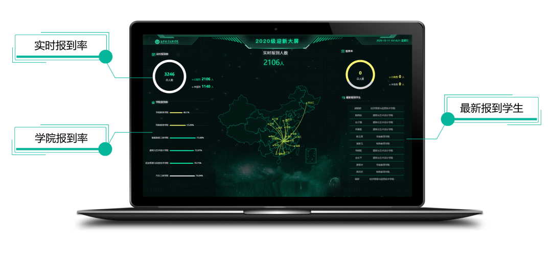 各個學院可以通過手機或者電腦實時查看新生的報到數據和動態,包括入學的人數、地區、報到率等等,隨時隨地掌握迎新工作的進展情況。
