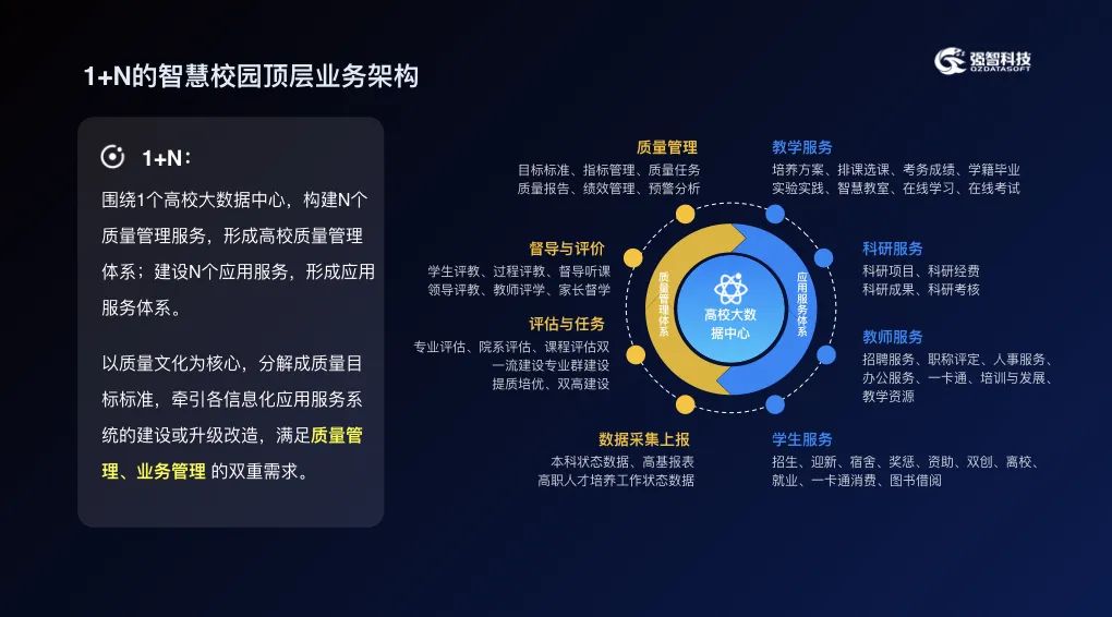 強智科技1+N智慧校園體系,以質量文化為核心,圍繞1個大數據中心,構建N個質量管理服務、建設N個應用服務體系,按新時代政策和發展的質量要求,牽引各信息化應用服務系統和數據中心的建設或升級,相互作用共同促進,滿足質量管理與業務管理的雙重需求。