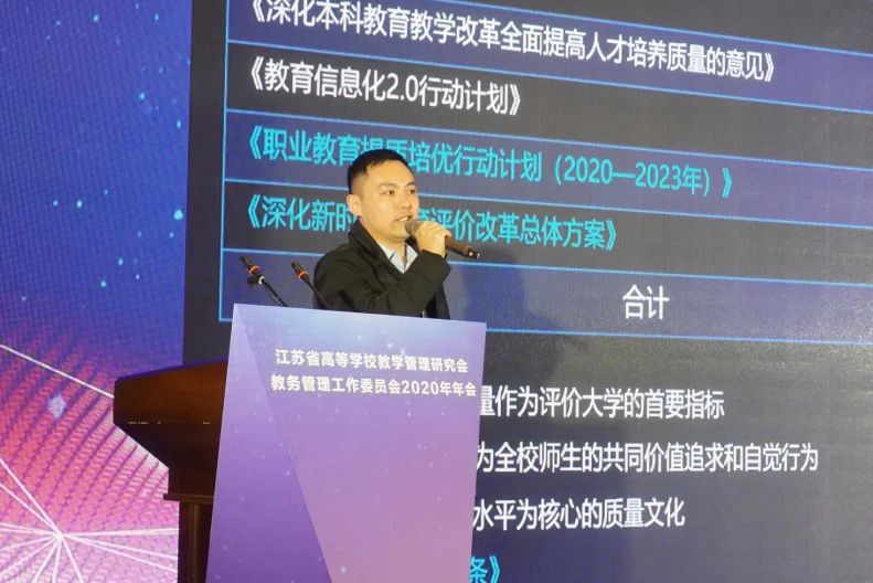 在大會報告環節,河海大學教務處沈揚、南京郵電大學教務處肖建、江蘇農林職業技術學院教務處丁威等專家、領導,分別圍繞“線上教學組織”“一流本科建設”“教學管理改革”等當前教學管理重點和熱點問題做了報告,報告精彩紛呈。會議還對江蘇省普通本科院校榜樣教務員進行了評選和表彰。
