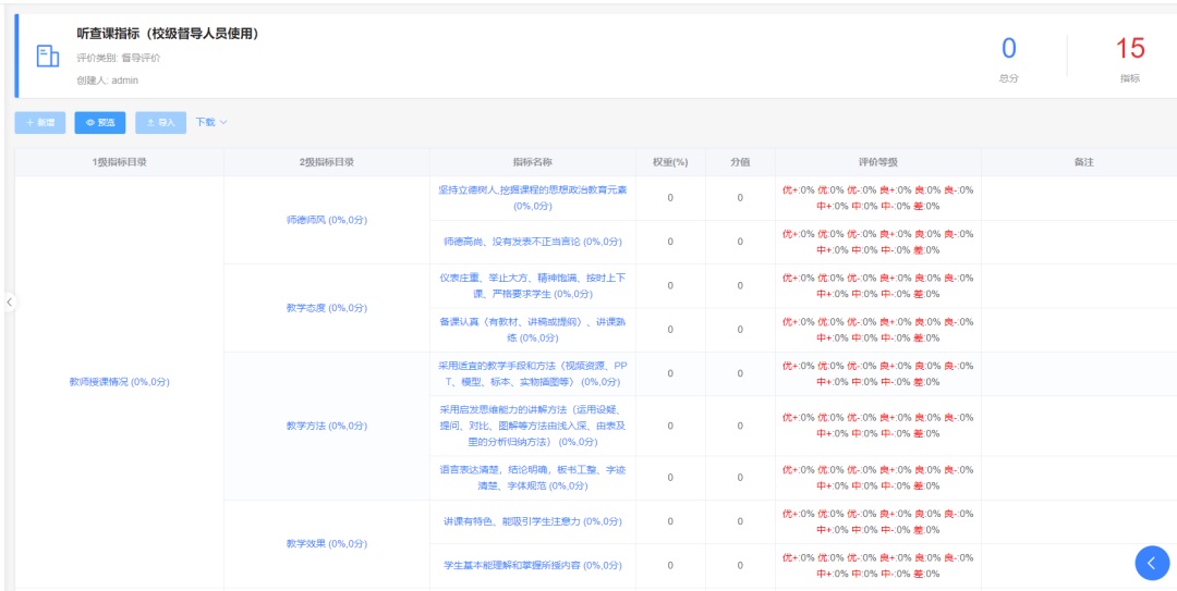 可設置課程屬性范圍、參評老師范圍、聽課人范圍、評價時間范圍、評價指標庫