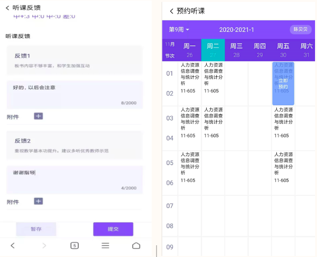 聽課課表與教務系統課表同步更新,聽課人通過移動端進行聽課預約和聽課評價,還可通過移動端與上課教師進行反饋與溝通。
