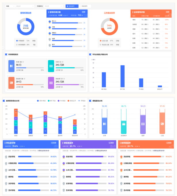 圖形化聽課分析,包括督導聽課比例、工作量達標情況、聽課課程情況、聽課結果分布等,數據一目了然,為下一階段教學評價改進提供有力的依據。