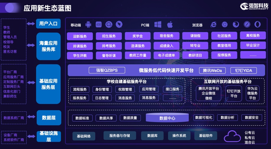 強智智慧校園應用新生態的建設以“服務”為出發點,以提高各大院校的“校園服務能力”為目標,基于微服務軟件開發平臺,為高校搭建海量的應用服務庫,打造學工服務、科研服務、教學服務、后勤服務、人事服務、資產服務等各大類校園服務模塊,覆蓋社團服務、報修服務、教研項目、迎新服務、宿舍服務、考務服務、選課服務、排課服務、電子成績單、畢業設計等上千個校園場景式服務微應用。