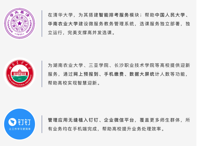 目前,強智微服務系列產品已服務包括清華大學、中國人民大學、中國農業大學、華南農業大學、湖南農業大學、湖南大學等上百所高校,位居行業前列,深受全國各大院校的青睞與關注。強智智慧校園應用新生態,聚焦新時期高校信息化發展需求,以大數據為中心,構建新生態應用服務,促進高等教育智慧化轉型,助力高校教育高質量、多層面發展,為廣大師生提供智能、便捷、高校的校園服務。