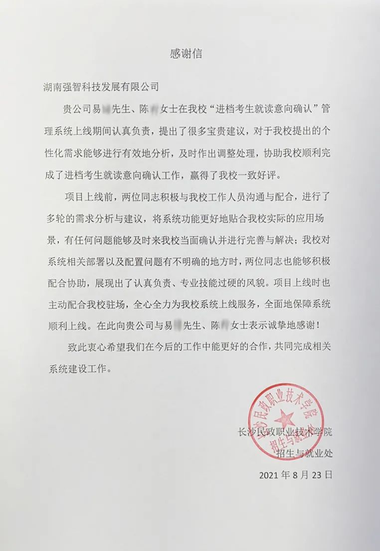 8月23日,強智科技收到了長沙民政職業技術學院發來的“感謝信”,信中提到“……對我校提出的個性化需求進行有效分析,及時調整,協助我校順利完成了進檔考生就讀意向確認工作,贏得了我校一致好評。”這是對我司產品的肯定,也是對我司服務的贊賞。