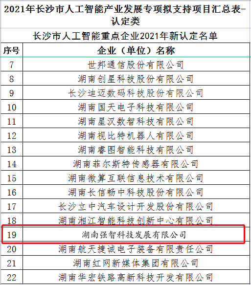 日前,長沙市工業和信息化局公示了“長沙市人工智能重點企業2021年新認定名單”和“2021年長沙市人工智能產業發展專項擬支持項目”,湖南強智科技發展有限公司經過嚴格的專家評審和現場考察,被認定為“長沙市人工智能重點企業”、“長沙市人工智能產業發展專項擬支持項目(應用示范類)”。