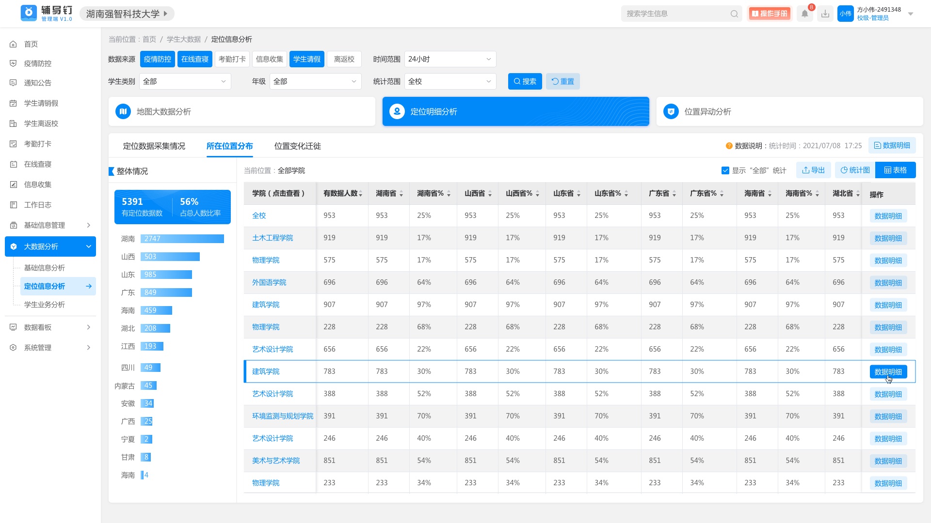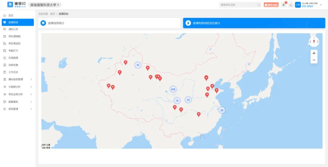系統將疫情信息統計與學生簽到定位數據相結合,實時展示動態地圖信息,智能篩選出中高風險地區的學生定位,數據一目了然。