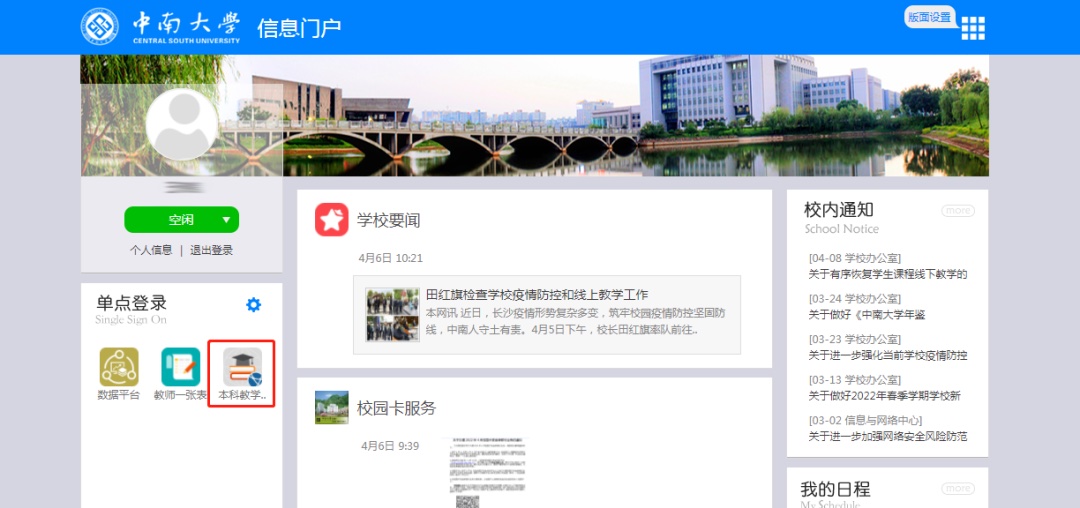 登錄中南大學信息門戶http://my.csu.edu.cn/portal/→點擊“單點登錄”圖標→點擊“本科網上服務”進入首頁
