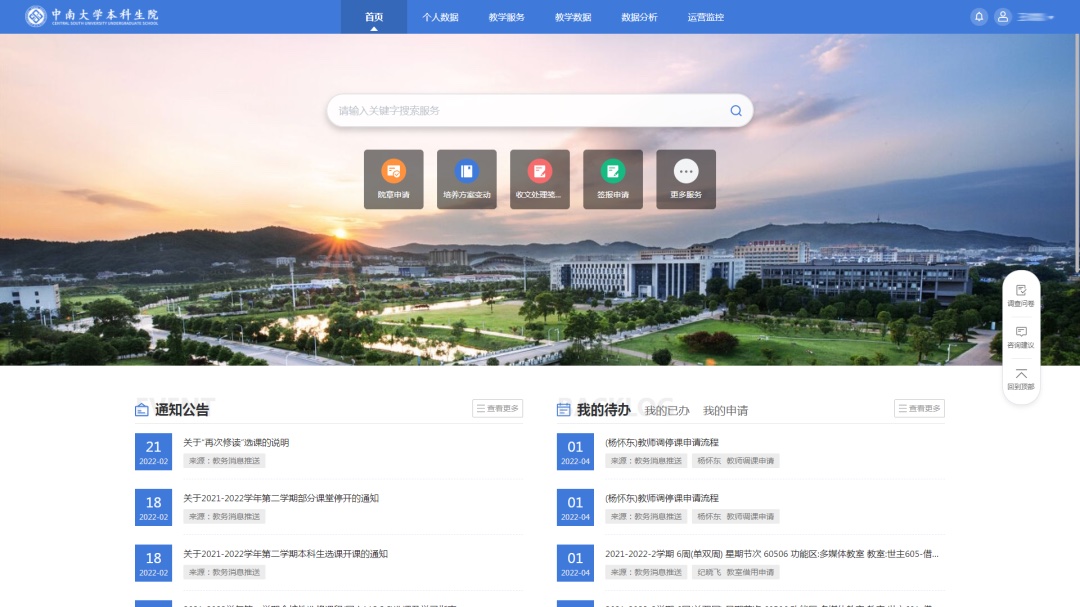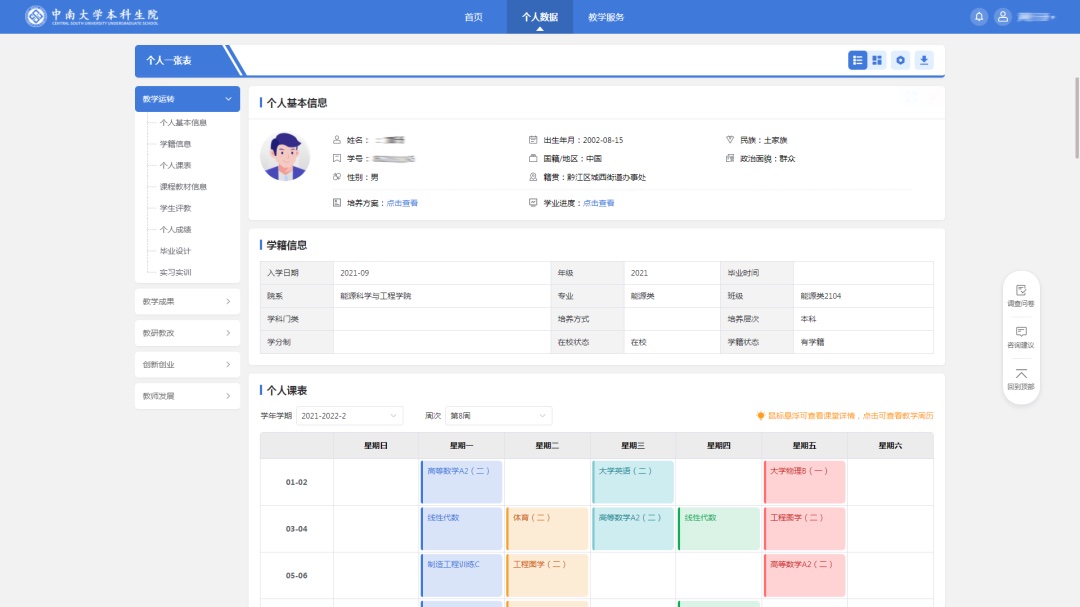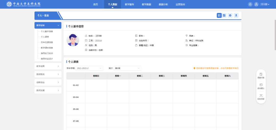 教師:可查閱您的個人信息、個人課表、歷年任課信息、教學課時信息等教學運轉信息,以及教學成果、教研教改、創新創業、教師發展等教學信息。