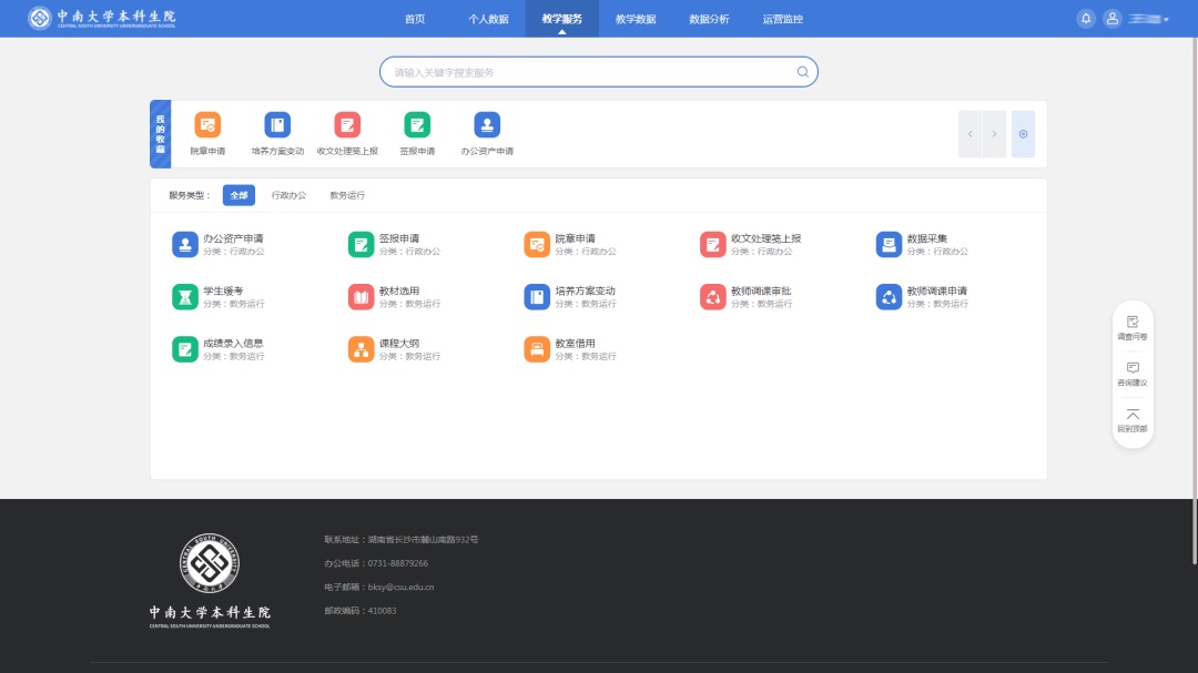 學生:可查閱您的個人信息、學籍信息、個人課表、課程教材信息、個人成績、個人論文、學生評教等教學信息,以及學科競賽、格美萊創新團隊獎、研習營、米塔爾優秀學生創新創業獎等創新創業信息