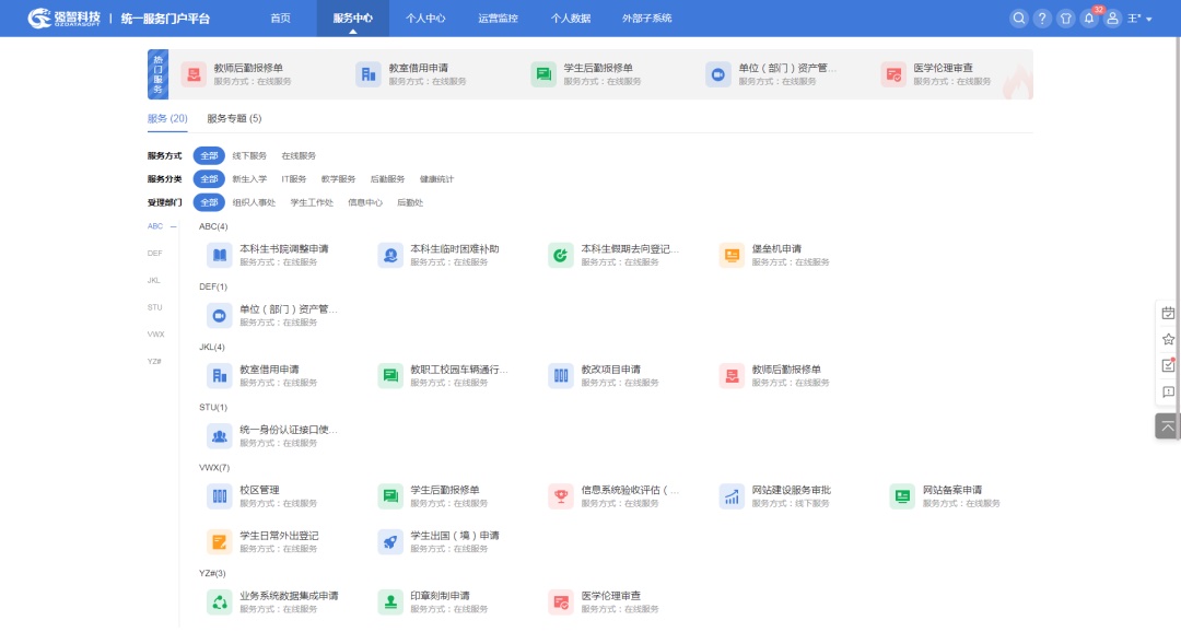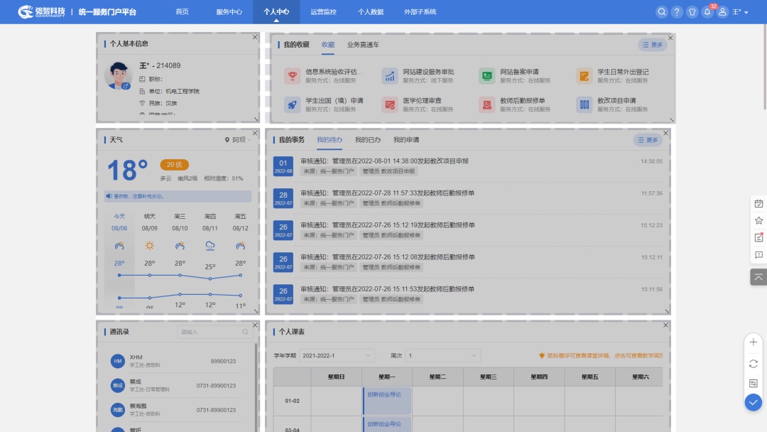 運用新興信息技術,基于統一身份認證、統一服務門戶和數據中心,聚合各類應用系統和微場景服務,可拓展黨政類、財務類、人事類、教務類、學工類、教輔類等20多個類別,300多個微應用,師生無需輾轉各個業務系統,就可以在PC端和移動端一站式查看、審批、申辦各類業務和跨部門協同,真正實現“一網通辦,一次不用跑”!
