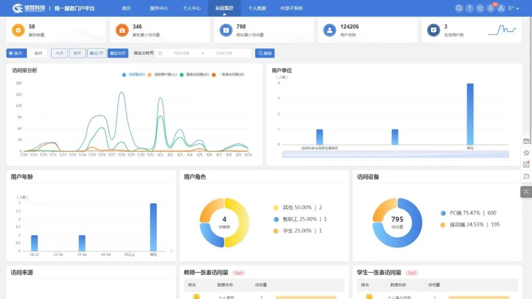 通過平臺運營監控可視化窗口,提供整體運營數據統計:服務總量、服務累積訪問量、網站累計訪問量、用戶總數、在線用戶數、24小時在線用戶趨勢等;以及訪問數據統計:訪問量分析、訪問用戶單位/年齡/角色分布、訪問設備分布、訪問來源分布、師生一張表訪問量top、服務訪問量top等等。
