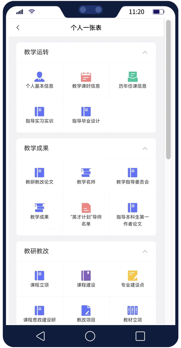 對教師的基本信息、歷年任課信息、評教結果信息、科研成果信息等數據進行收集獲取,并提供集中查詢與展示,教師可以查閱個人信息、個人課表、歷年任課信息、教學課時等教學運轉信息,以及教學成果、教研教改、創新創業、教師發展等;