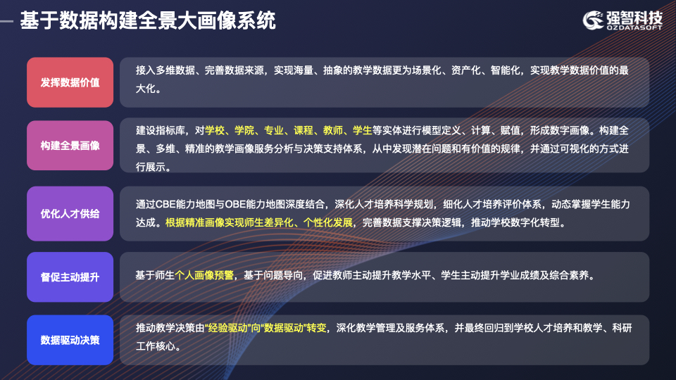萬見高介紹,大數據不再是冰冷的結果數據、歷史數據,而是鮮活的實時過程數據,它圍繞師生各種活動來展開,為數據注入了強有力的生命力,以此來構建高校人才培養的大數據路標。