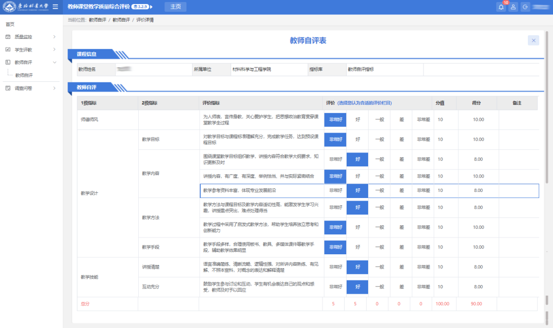 教師每學期依據評價指標,對所授課程進行自我評價。評價指標可設置多級,強調教學內容、課堂互動和教學效果,形成教學反思和持續改進。