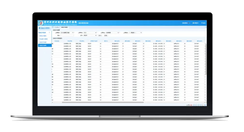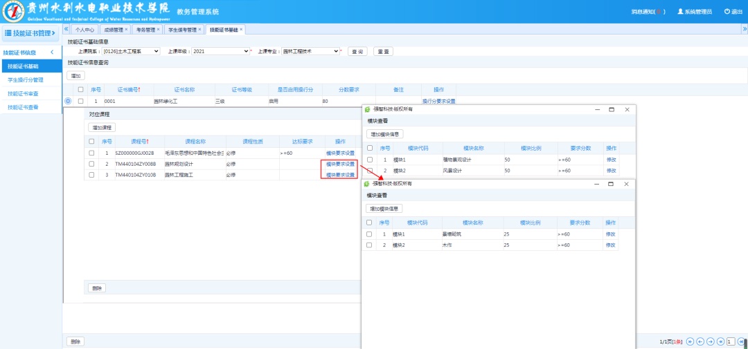 為落實學生“雙證書”行動試點工作,構建模塊化課程成績與職業技能認定互通的管理系統,提高雙證書過程性評價信息化管理水平,貴州水利水電職業技術學院與強智科技合作,在教務核心系統之外,進行雙證書管理小子彈(微應用)的開發。