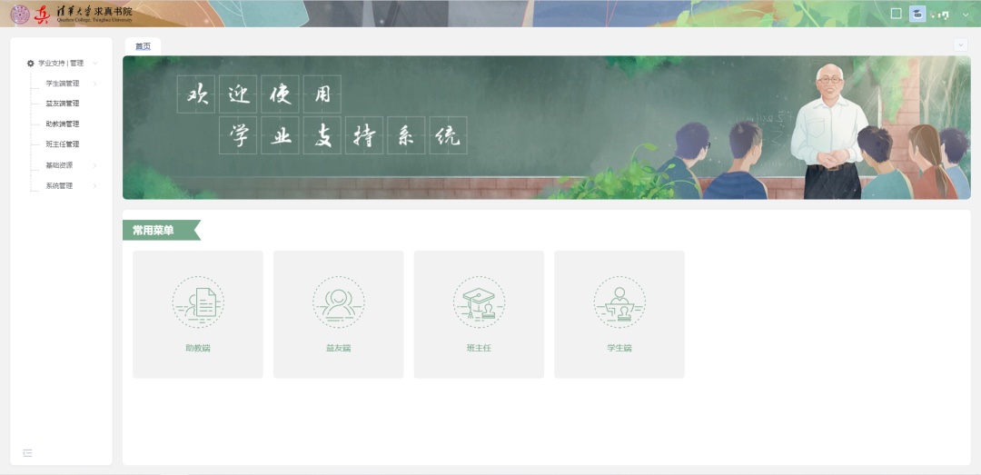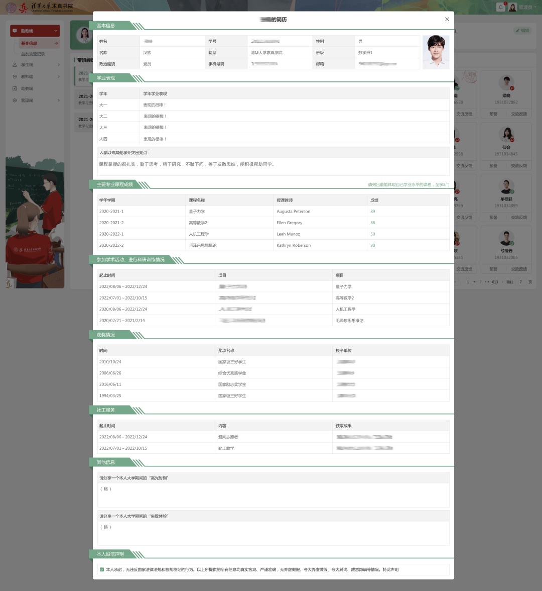 清華大學求真書院學業支持系統,針對學生與班主任、助教、益友之間的互動交流提供跟蹤記錄服務,通過各種教學活動和交流活動,實時記錄反饋學生的上課情況、作業情況、課后交流等學業情況,助力管理團隊分析學生學業數據,為個性化培養計劃提供建設性意見。