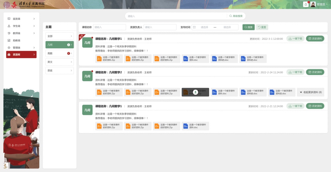 書院管理團隊可以上傳發布文件,如教材、電子講義、學術報告等資源,建立資源庫,學生、助教、益友、班主任根據不同的權限可以查看、下載各類文件資源??筛呒壦阉魑募热?。