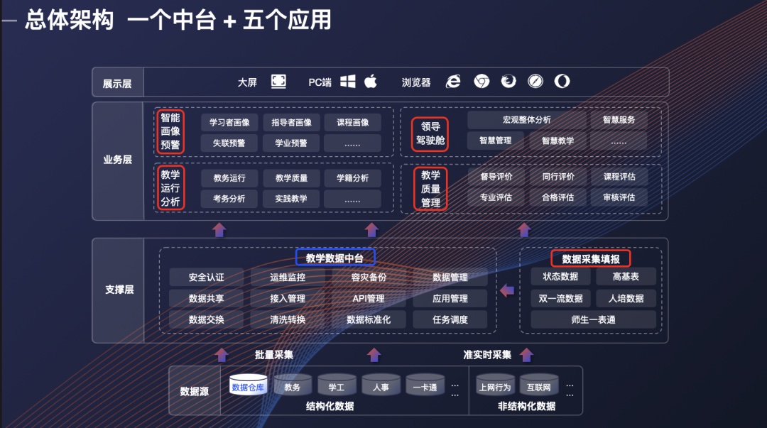 教學質量大數據決策分析系統基于教學數據中臺的搭建,為學校提供智能畫像預警、教學運行大數據分析、領導駕駛艙、教學質量管理、數據采集填報五個應用,形成“1個數據中臺+N個數據應用”的服務模式。
