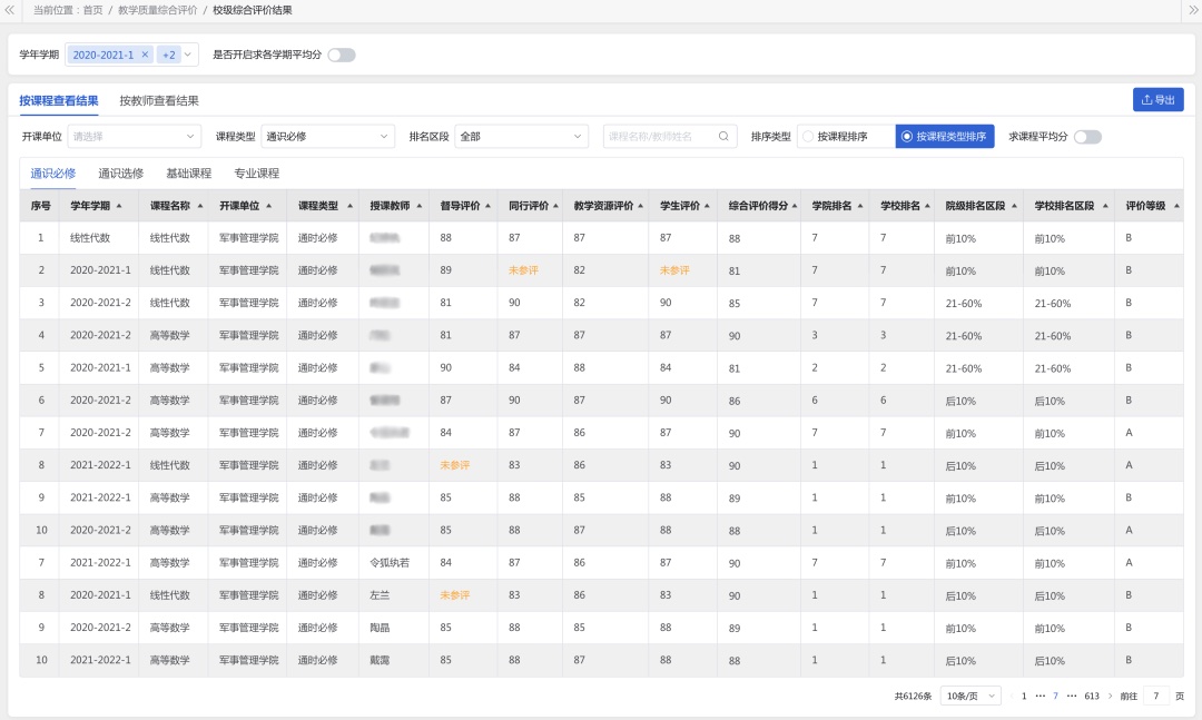 通過學校本科人才培養方案中的課程類型進行類內比較,按照通識必修、通識選修、基礎課程和專業課程等四類課程分類,全方位展示該任課教師的學生評價、督導評價、同行評價、教學資源評價分數,綜合評價分數,以及在學校和學院中的排名。
