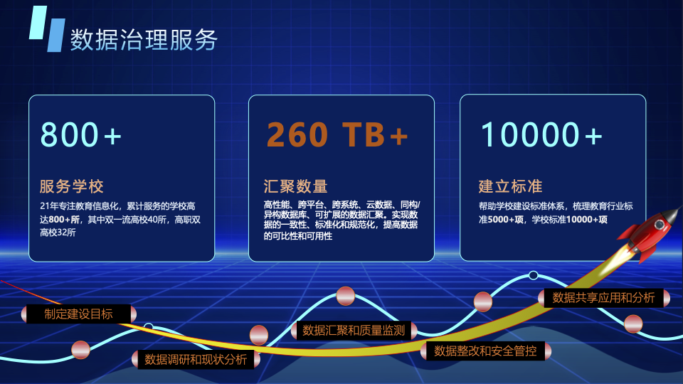 程鵬提到,數據賦能數字化轉型,重點在于提升數據解決問題的能力。以“數據”為核心,持續改善“制定策略和目標、數據確源和集成、數據監測和治理、數據安全和管控、數據共享和分析”五大能力。例如,智慧大腦院校上報平臺,為全國職業院校提供了數據調研、數據采集、數據質量核驗、數據審批與復核、數據上報等服務,助力職業院校建設數字化教育管理和監測體系,支撐高質量數據治理服務能力。