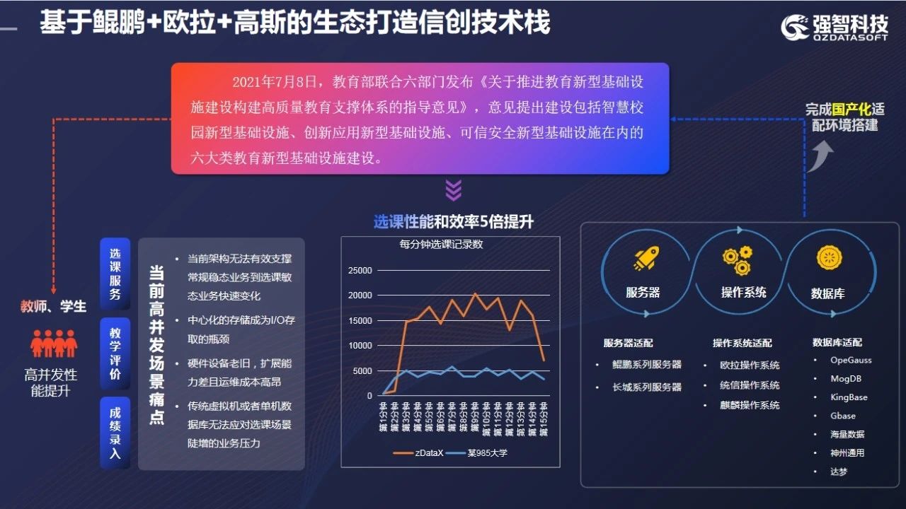 最后,程鵬強調高校在數字化轉型過程中的數據安全問題,并表示,強智科技基于鯤鵬+歐拉+高斯的生態打造信創技術棧,解決教學管理中高并發場景痛點,從技術體系、組織保障方面,搭建全方位安全可靠的架構,為高校數字化轉型保駕護航,持續賦能。