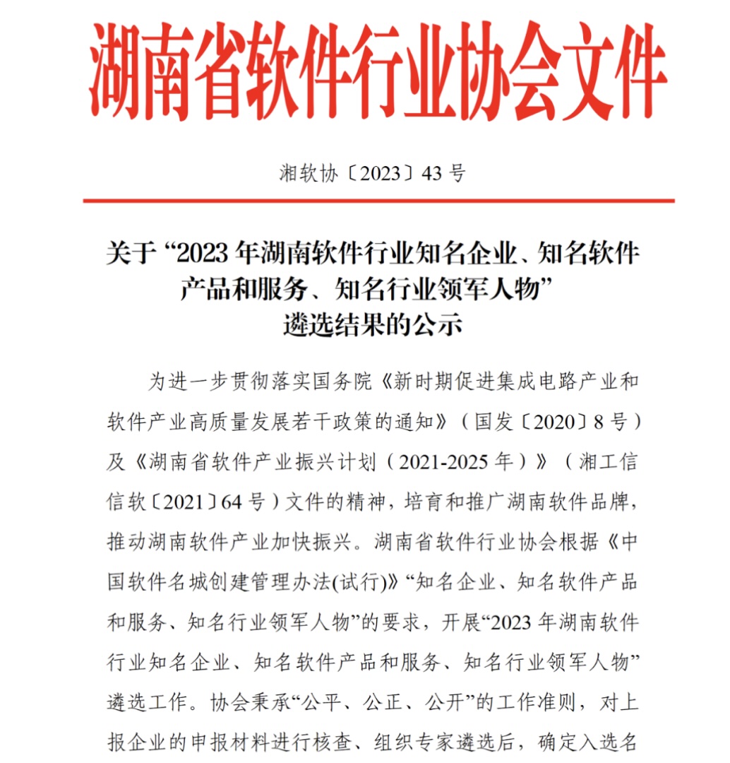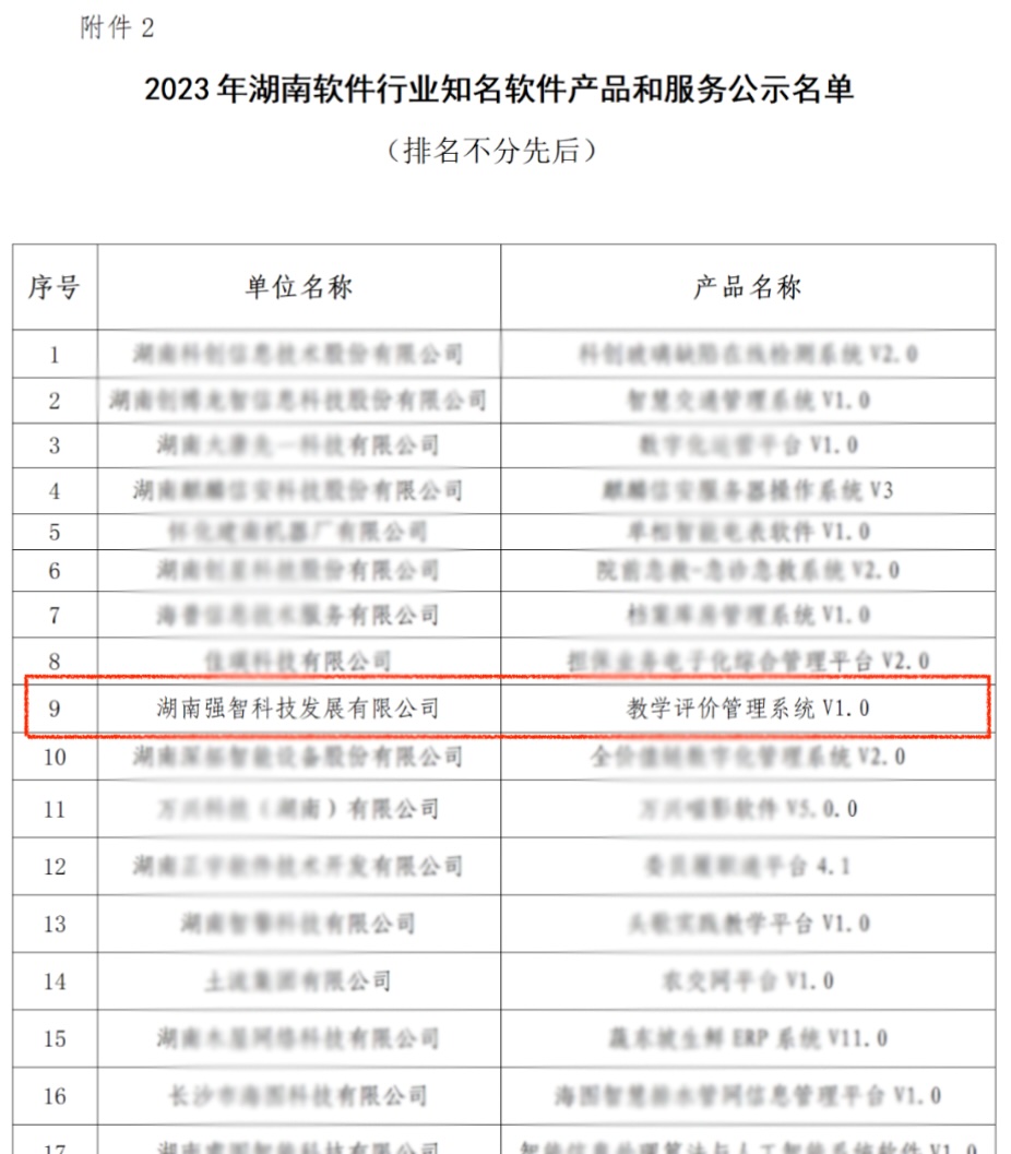 2023年12月10日,湖南省軟件行業協會對“2023年湖南軟件行業知名企業、知名軟件產品和服務、知名行業領軍人物”遴選結果進行公示,經嚴格核查、組織專家遴選,強智科技入選“2023年湖南軟件行業知名企業”,教學評價管理系統V1.0入選“2023年湖南軟件行業知名軟件產品和服務”。
