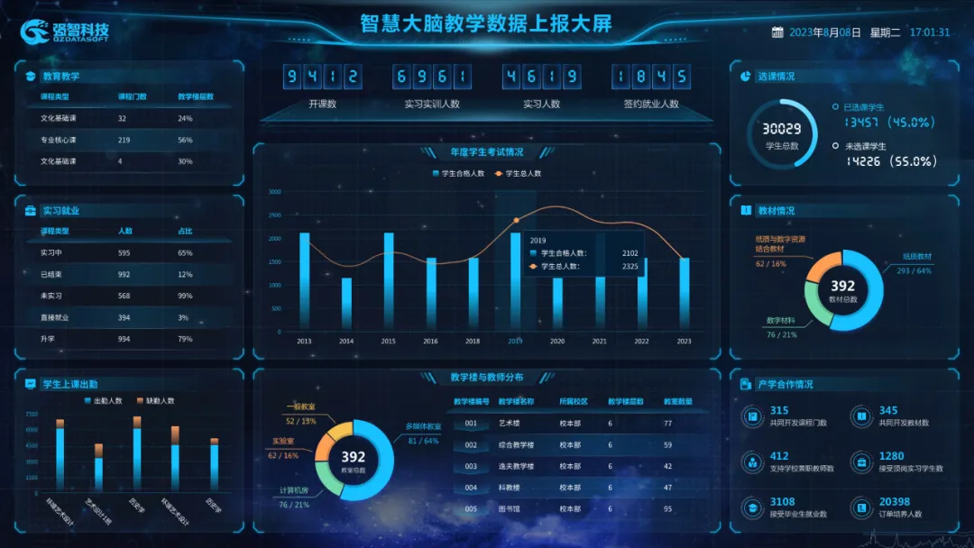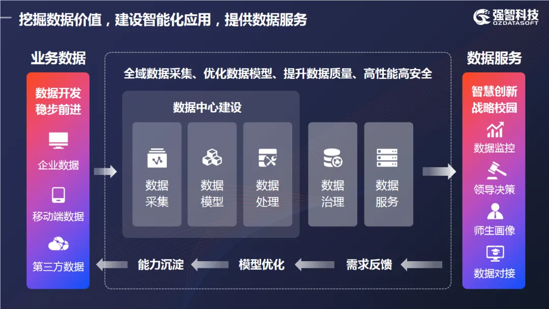 強智科技助力學校完善數據標準管理、數據質量管理、數據安全保護、數據共享與開放等,覆蓋數據的全生命周期,從數據的采集、存儲、處理、分析和應用等各個環節,通過校本數據中心,涵蓋職業學?;巨k學條件、專業設置、課程開設、師生信息、企業信息等基礎數據,打造校本綜合平臺,強化數據無感采集、全量匯聚、智能分析能力,提升數據治理能力和水平。