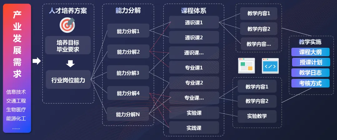 ? 基于OBE理念,從人才培養頂層設計入手,實現行業人才需求、培養規格、畢業要求、課程體系、教學安排、單元設計的銜接貫通和過程監測,明確學生畢業時應具備的能力,組織教學各個環節,分析學生學習的產出,反向設計教學培養目標,開展教學實踐活動。