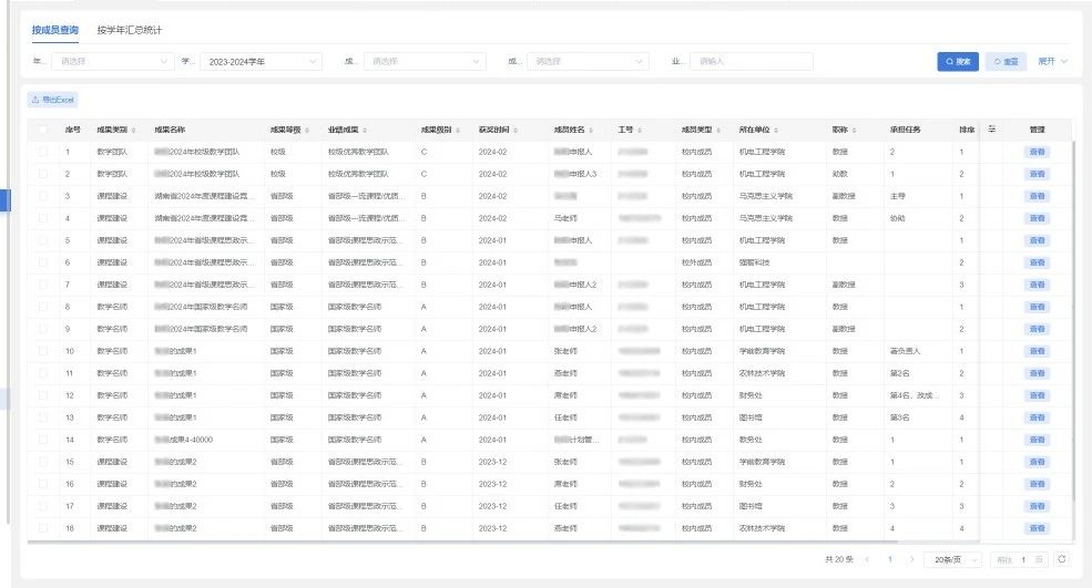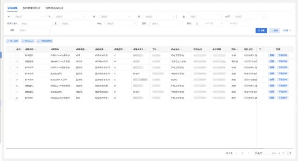 依照學校的實際使用需求,平臺可單獨管理教學成果,如項目產出的論文、專著、專利、獲獎情況等各類成果信息的管理,并自動化生成教學成果庫。