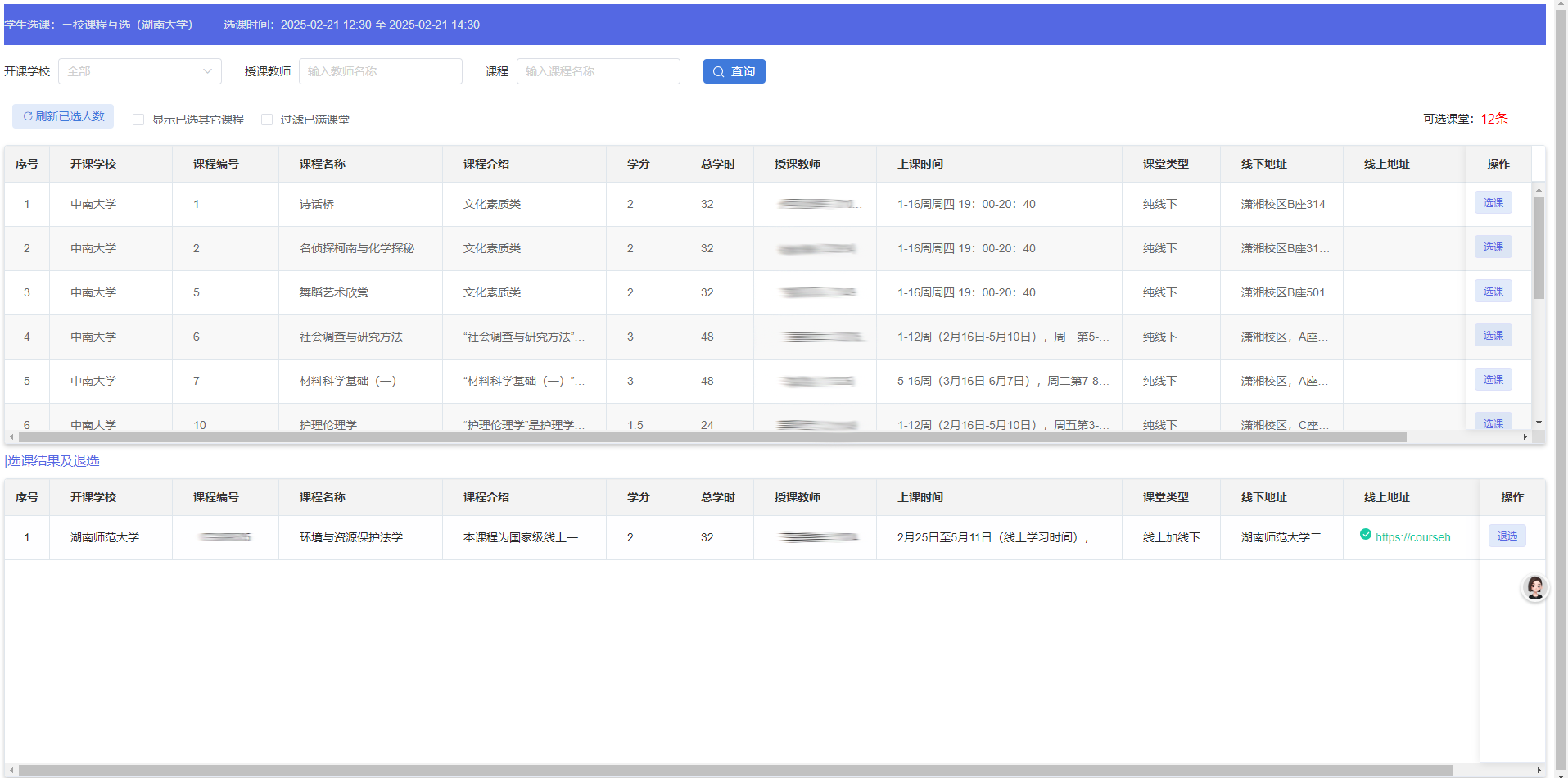 教師:點擊個人課表,查看上課時間及選課學生名單等。