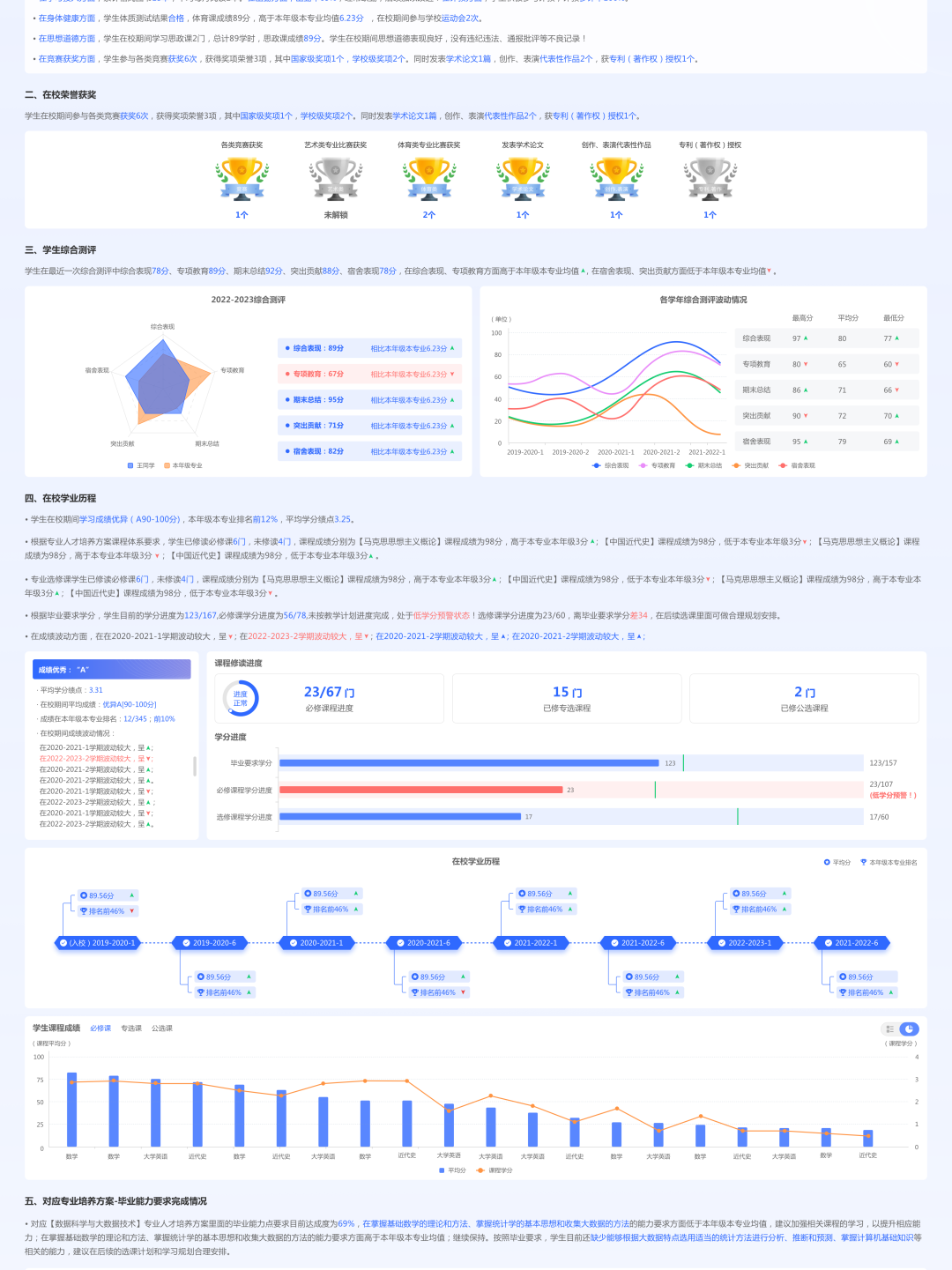 ? 學生畫像:深度挖掘學習能力、學習行為、能力圖譜、身心健康、思想道德、校園生活、學業達成、獎學勤貸懲處各類過程性數據,自動生成學生成長報告,構建多元化、智能化、動態性、連續性的學生學業評價大數據模型,生成學生學業數字“畫像”。